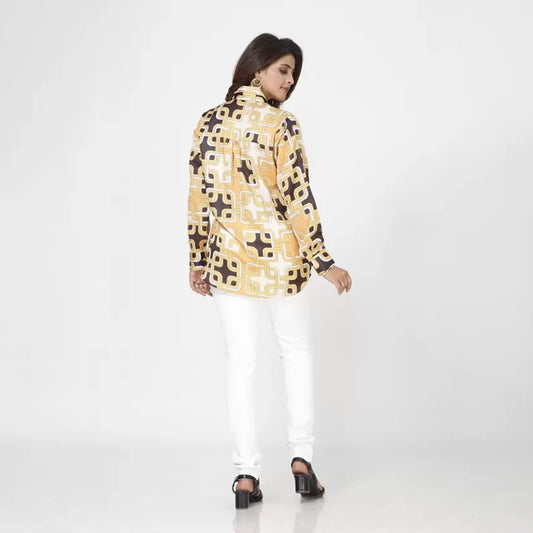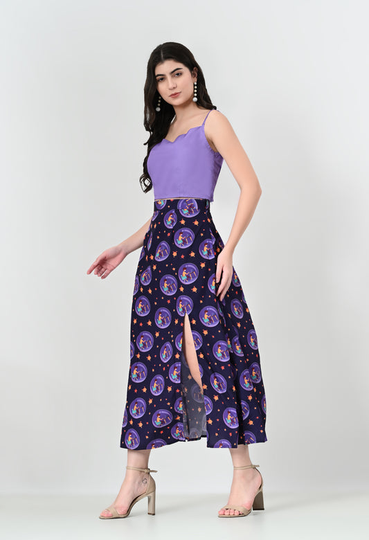 Trendy Two-Piece Crepe Outfit with Sleeveless Cropped Top and Patterned Long Skirt