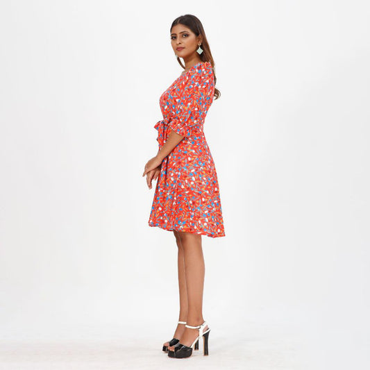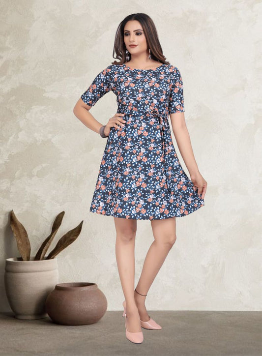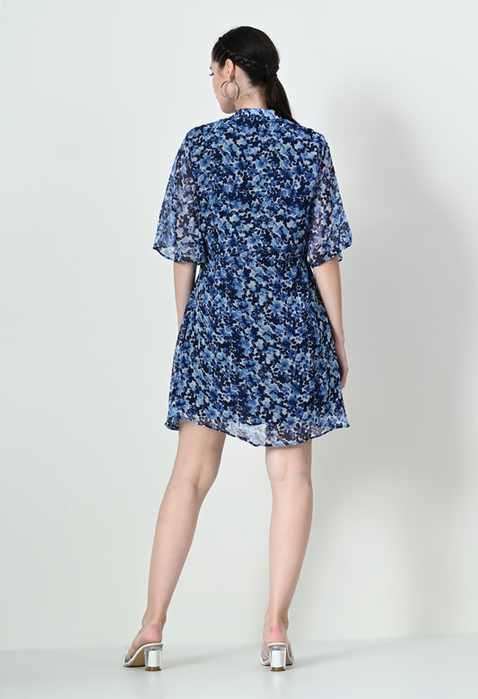 Stylish High Neck Blue Print Mini Dress in Chiffon and Butter Crepe Fabric